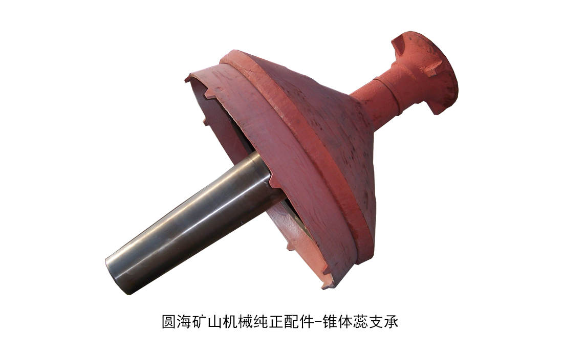锥体蕊支承:锥体蕊支承在球面轴承上,并固定在一个悬挂竖轴(主轴)上,竖轴置于偏心套筒(内铜)内,而偏心套又置于止推轴承上。 动锥体与竖轴一同由偏心轴套带动,偏心轴套借水平轴及皮带轮并经伞齿轮来传动。皮带轮则由电动机经三角皮带传动。竖轴的下部装入偏心套筒中,当偏心套筒旋转时,以轴划出一个圆锥面,因此动锥体靠近不动锥时矿石即被压碎。